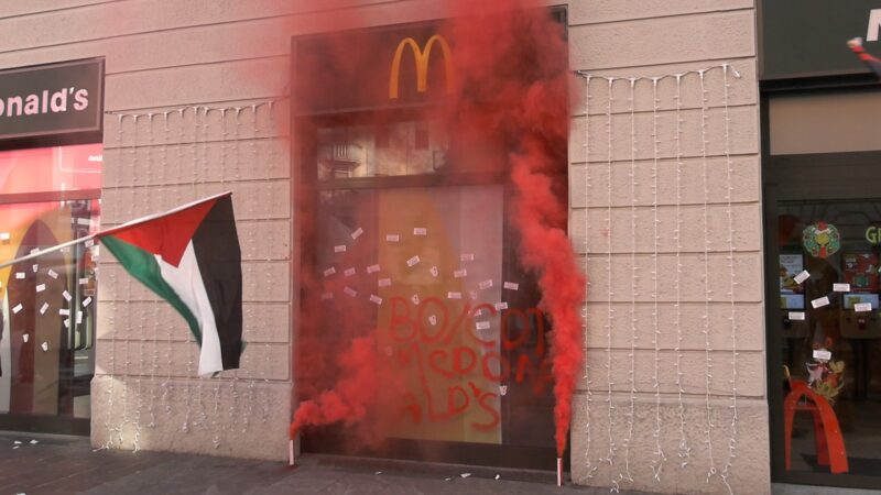 Milano, 28 novembre 2025 – Durante il corteo di questa mattina a Milano, alcuni manifestanti hanno imbrattato i due McDonald’s di corso Buenos Aires. Sulle vetrate sono comparse scritte come “Boycott McDonald’s” e “Free Palestine”, realizzate con bomboletta spray e pennarello, insieme a adesivi che accusano il marchio di supportare il genocidio.